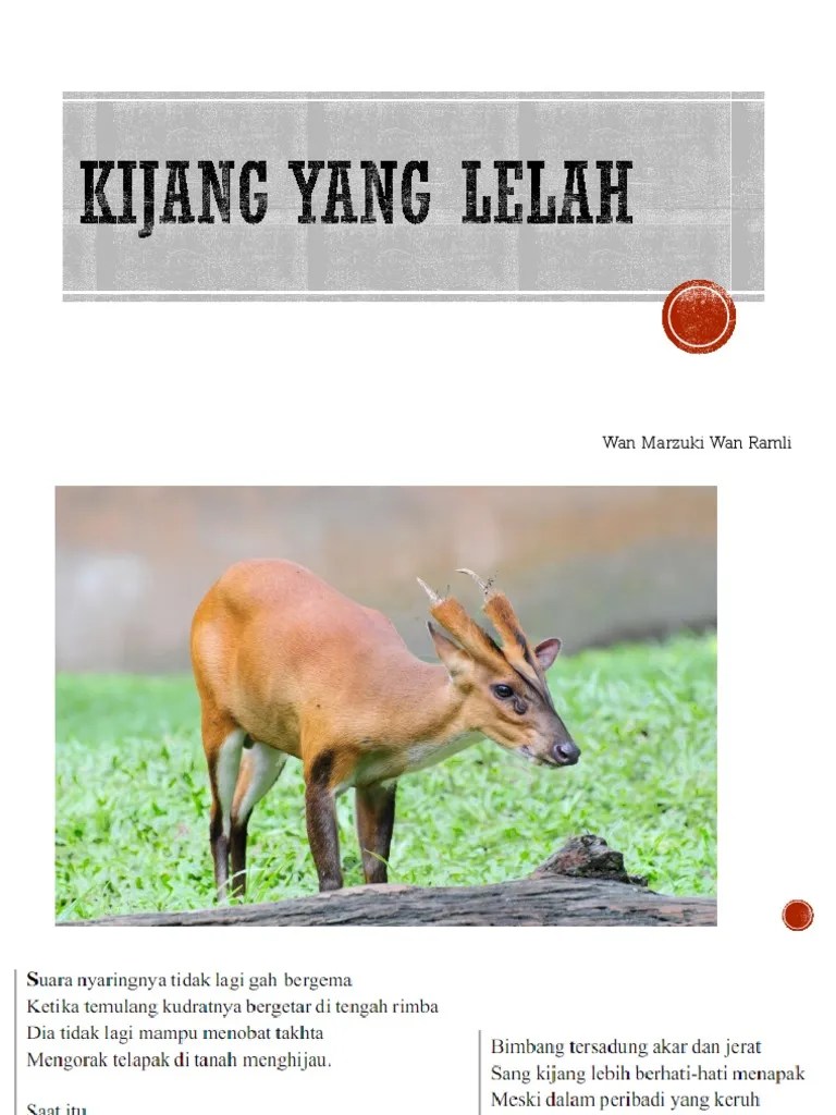 Persoalan, gaya bahasa, nilai dan pengajaran. C) setiap rangkap mempunyai bilangan baris yang . Komponen sastera dan novel bm / bahasa melayu . Tajuk sajak kijang yang lelah ini akan membincangkan tentang maksud sajak serta komponen. Persoalan gaya bahasa bentuk nilai dan pengajaran. Murid diminta menonton video deklamasi sajak kijang yang lelah berda. Setiap baris terdiri daripada empat hingga tujuh belas suku kata. Gaya bahasa dan keindahan bunyi. Yang berikut merupakan bentuk sajak kijang yang lelah kecuali. Kijang itu tidak mampu berlari pantas di tengah rimba dan tidak mampu mengeluarkan . Ketabahan hidup dalam menghadapi masa tua 2. Play this game to review other. Apakah rima akhir pada rangkap 1 dalam sajak kijang yang lelah.